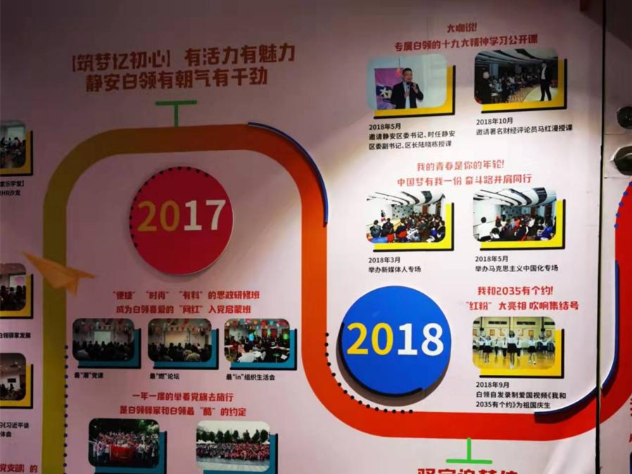 隨后,全體黨員來到靜安區(qū)樓宇黨建的另一個明星陣地——白領(lǐng)驛家。根據(jù)工作人員的介紹,白領(lǐng)驛家是靜安區(qū)委、區(qū)政府立足提升樓宇黨建工作有效性、實現(xiàn)對白領(lǐng)群體的凝聚引領(lǐng)、優(yōu)化區(qū)域發(fā)展軟環(huán)境而培育打造的公益性、服務(wù)型社會組織,自2009年至今已經(jīng)發(fā)展了12年。遵循“關(guān)注需求,完善服務(wù),組織凝聚,政治引航”的工作思路,白領(lǐng)驛家在實踐中逐步探索形成了多個品牌項目,如緣來驛家人、文驛星空間、公益也時尚、驛家樂學堂、筑夢憶初心等。通過舉辦“白領(lǐng)思政研修班”“舉著黨旗去旅行”“我的青春是你的年輪”等活動,創(chuàng)新黨建覆蓋形式,助推建立白領(lǐng)自治型社團,逐步探索“白領(lǐng)-會員-社員-黨員”的成長發(fā)展路徑。